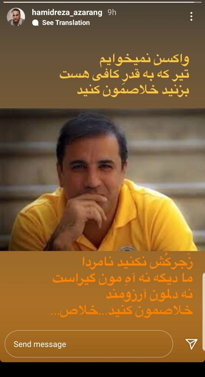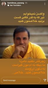 حمیدرضا آذرنگ، هنرپیشه سینما و تلویزیون در یک استوری اینستاگرامی با انتشار تصویری از علی سلیمانی که بهعلت کرونا جان خود را از دست داده، نوشت: