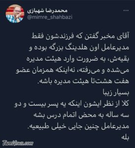 به گزارش تازهنیوز، محمدرضا شهبازی، مجری شبکه افق در واکنش به صحبتهای مخبر، معاون اول سید ابراهیم رئیسی درباره پسرش در صفحه شخصی خود در توئیتر نوشت: آقای مخبر گفتن که فرزندشون فقط مدیرعامل اون هلدینگ بزرگه بوده و بقیهش، به ضرورت وارد هیئت مدیره میشده و میرفته، نه اینکه همزمان عضو هفت هشتتا هیئت مدیره باشه.
