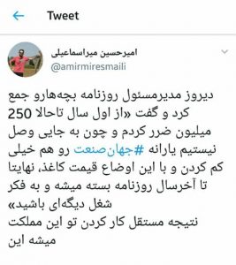 از سوی دیگر امیر حسین اسماعیلی، خبرنگار روزنامه جهان صنعت خبر از توقف انتشار این روزنامه در سال آینده داد.